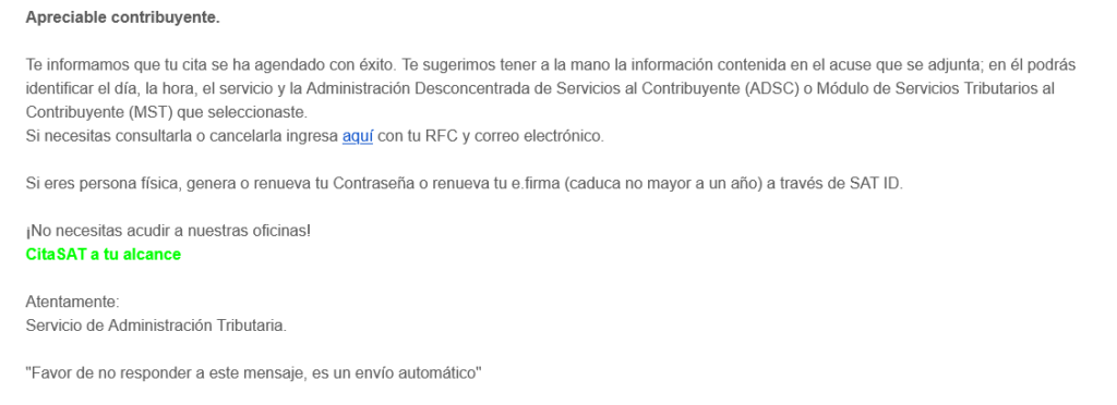 Posteriormente a ello, se notificara un correo en el cual “tenemos que confirmar nuestra asistencia” y con ello, se indicaría el día y hora en el que tenemos que ir a las oficinas del modulo SAT que elegimos.